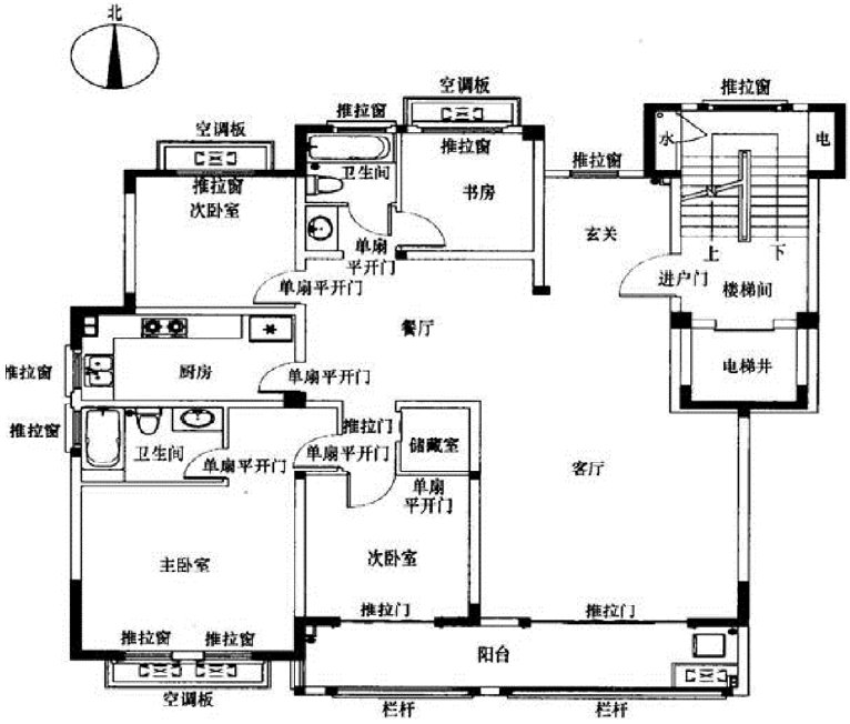 【解析】房屋户型图中房屋朝向一般为“上北下南、左西右东”,并用箭头或指针标注正北方向。通过房屋户型图可以清晰地看到该户型的房屋朝向、入口、房间内部布局(包括客厅、卧室厨房、卫生间、阳台的布局、数量和组合关系)以及门、窗的位置等。根据图中指针标注的正北方向可以判断出此房屋户型为南北朝向。