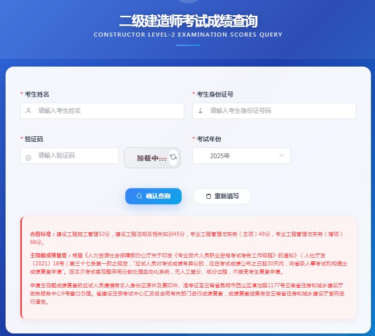 (一)通过云南省建设监管公共服务平台(https://www.ynjzjgcx.com/index)--快捷功能--“二级建造师考试成绩查询”模块,输入考生姓名、身份证号及验证码查询成绩。